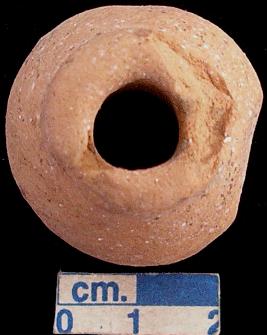 | Description / विवरण | Tettacotta ghat-shaped spindle whorle, red, flat around base perforation. |