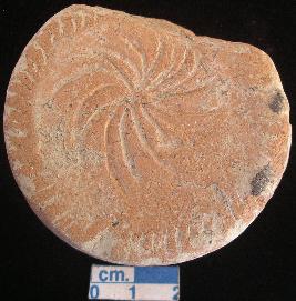| Description / विवरण | Terracotta disc, large-sized, made of well levigated clay, reddish, bearing oblique incised notches on the periphery with solar symbol at the center on both the surfaces, slightly damaged. |