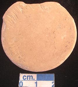 | Description / विवरण | Terracotta disc, damaged, reddish, notches on the periphery on both the surfaces, one surface is also decorated with notches in a circle. |