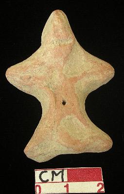 | Description / विवरण | A star shaped terracotta archaic male figurine, with round head, red, hand made, pin hole eyes, pinched nose, open slit mouth, short out stretched stumpy arms, deep punched navel, short wide bridged stumpy legs, phallus indicated. |