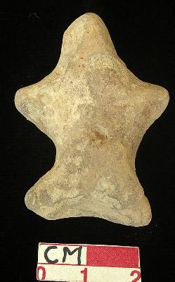 | Description / विवरण | A star shaped terracotta archaic human figurine, with round head, hand made, traces of pin hole eyes, pinched nose, open slit mouth, short out stretched stumpy arms, deep punched navel, short wide bridged stumpy legs, blackish due to over firing. |