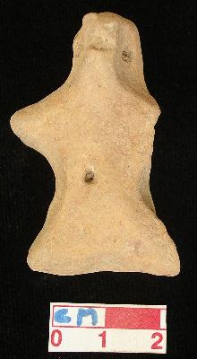 | Description / विवरण | A terracotta archaic human figurine with flat head, red, punched eyes, pinched nose and mouth, short out stretched arms but the left one is broken, punched navel, short out stretched legs, treated with red wash, handmade. |