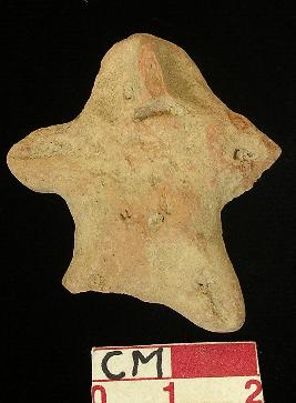 | Description / विवरण | A star shaped terracotta archaic human figurine, with round head, red, hand made, pin hole eyes, pinched nose, open slit mouth, short out stretched stumpy arms with one incised line in each, short wide bridged stumpy legs with one incised line in each, right one broken, treated with red wash. |