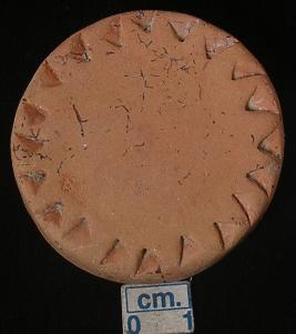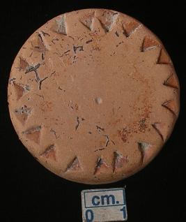 | Description / विवरण | Terracotta disc, red, bears triangular notches on the edges of both the surfaces, sides are plain. |