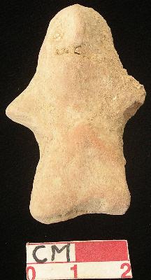 | Description / विवरण | A terracotta archaic human figurine with round head, punched eyes, pinched nose and slit open mouth, short out stretched stumpy arms but left is slightly broken, short wide bridged stumpy legs but left is slightly broken, dull red colour, handmade. |