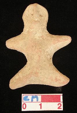 | Description / विवरण | A terracotta archaic human figurine with top flat head , red, pin hole eyes, pinched nose and mouth, short out stretched pointed arms, short out stretched legs, treated with red wash, handmade. |