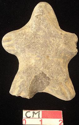 | Description / विवरण | A terracotta archaic human figurine with round head, punched eyes, pinched nose and mouth, short out stretched stumpy right arm with three incised lines but left is broken, punched navel, chain in waist, short wide bridged stumpy left leg with two incised lines but right is half broken, grey in colour, handmade. |