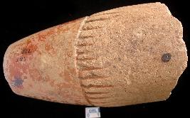 | Description / विवरण | Fragment of a terracotta skin rubber, bearing incised lines on the surface, red. |