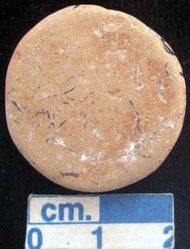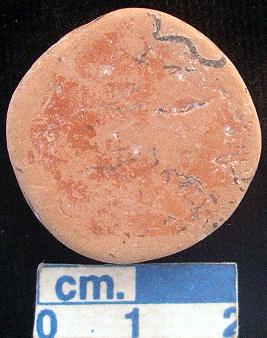 | Description / विवरण | Terracotta small-sized disc, red, traces of red slip on both the plain surfaces and sides, irregular circular. |