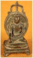 | Description / विवरण | The image of Buddha is seated in Vajra-paryankasana posture on a lotus pedestal. He is surrounded by a oval shaped halo with a border of two plain mouldings edged by a row of beads. It is crowned by the umbrella with a bud shaped final. He is in bhumisparsa mudra. Spiral curls cover the Ushnisha. There are two streamers hanging from the umbrella. |