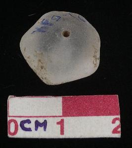 | Description / विवरण | A stone bead, pentagonal, transperent and white in colour, thin perforation acorss. . |