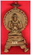 | Description / विवरण | The goddess is seated in the vajra-paryankasana posture on a visva-padma with high stamens above a footed oblong pedestal. Of the four hands of the deity, the two natural ones resting on the lap, are in the dhyana-mudra with a bowl on the right palm. Her upper right palm holds a rosary, while the corresponding left bears a water-pot. Attired in a sati, with folds indicated by incised lines, and an uttariya worn in an upaviti fashion, the goddess is bejeweled in beaded anklets, bangles, armlets, bangles, armlets with a flower-shaped central piece, a necklace with a long floral pendant, kundalas and a short crown at the base of the high conical jata-mukuta. The eyes are inlaid with silver. |