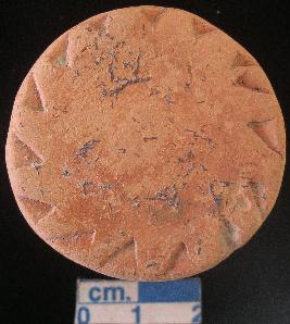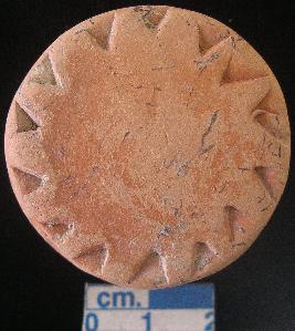 | Description / विवरण | Terracotta disc, red, traces of red slip all over, triangular notches on the edges of both the surfaces, sides are plain. |