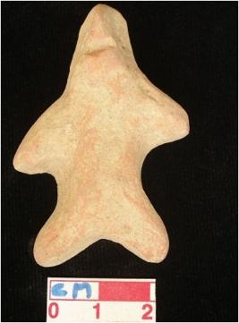 | Description / विवरण | A terracotta archaic human figurine with long head, red, punched eyes, pinched nose, open slit mouth, short out stretched arms, short stumpy legs, treated with red wash, handmade. |