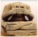 | Description / विवरण | Kubera, the god of wealth and the lord of earthy treasures, is the regent of the northern direction. He is sitting in padmasana on a pedestal. He has a pot-belly. He has two hands. Each hand holds a jar of nidhi decorated with some flora motifs. He is wearing armlets, bracelets and a garland. Upper portion of the image is broken. Only shoulders to downward visible. |