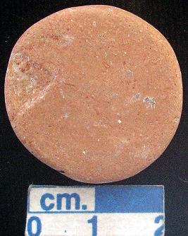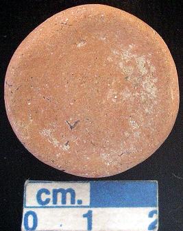 | Description / विवरण | Terracotta disc, small-sized, reddish, slightly damaged, both the surfaces and sides are plain. |