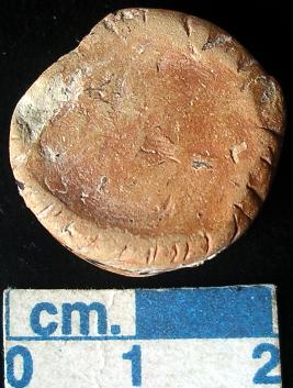 | Description / विवरण | Terracotta small-sized disc, red slipped, bearing notches on the edges of both the surfaces, sides are plain. |