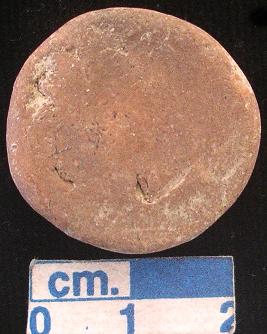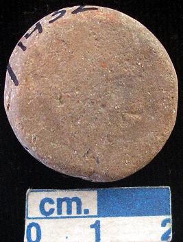 | Description / विवरण | Terracotta small- sized disc, red, rice husk impressions and mica particles are seen, both the surfaces and sides are plain. |