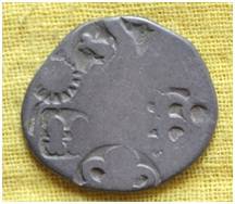 | Description / विवरण | The coin is an imperial type of Punch- marked coin. It is irregular in shape. Obverse Sun, six arched hill, two taurines in a box, tree with branches. Reverse Sun, Six armed wheel and other symbols are not clear. |