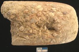 | Description / विवरण | Fragment of a terracotta pestle, having small stone studded teeth on under surface, broken. |