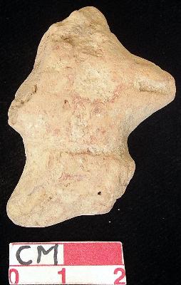 | Description / विवरण | A terracotta archaic human figurine, red, pin hole eyes, pinched eyes, open slit mouth, short out stretched arms, short out stretched legs out of which the left one is broken, treated with red wash, handmade. |