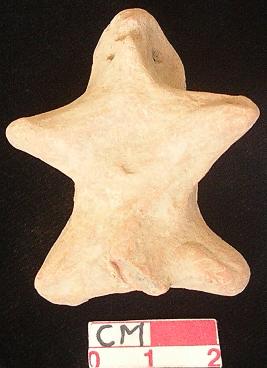 | Description / विवरण | A terracotta archaic human figurine with irregular round head, red, punched eyes, pinched nose and mouth, out stretched arms, pin hole navel, short wide stretched legs, broken phallus indicated, |