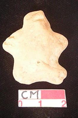 | Description / विवरण | A small terracotta archaic human figurine with round head, punched eyes, pinched nose and slit open mouth, short out stretched stumpy arms with one incised line in each, punched navel, short wide bridged stumpy legs, dull red colour, handmade. |