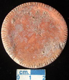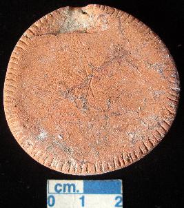 | Description / विवरण | Terracotta disc, red, traces of red slip on one surface, notches on the periphery of both the surfaces. |