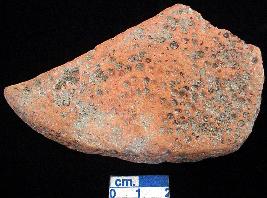 | Description / विवरण | A fragment of terracota skin rubber, red, circular sallow dents on both surfaces and sides. |