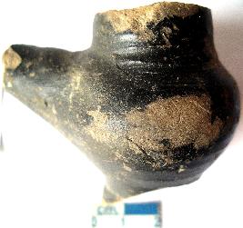 | Description / विवरण | A bird shaped terracotta rattle, black slipped all over, feathers around neck, back and tail indicated by notches, is almost round. |