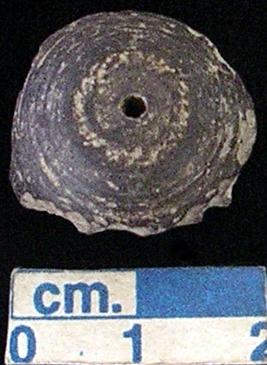 | Description / विवरण | Terracotta damaged areca nut shaped bead, black, hole across, |