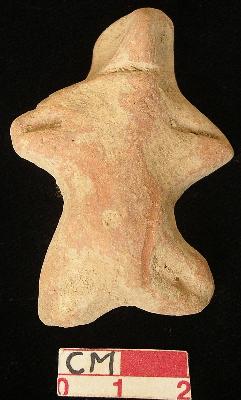 | Description / विवरण | A terracotta archaic human figurine with round head, punched eyes, pinched nose and slit open mouth, short out stretched stumpy arms with one incised line in each, short wide bridged stumpy legs with one incised line in each, red colour, handmade. |