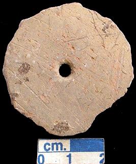 | Description / विवरण | Pottery spindle-whorel, damaged, dull red ware, having a perforation in the center. |