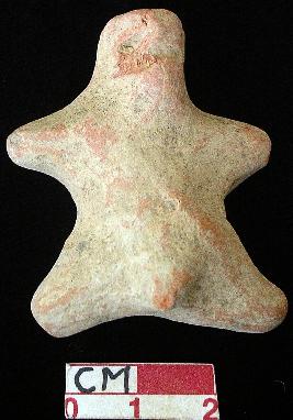 | Description / विवरण | A terracotta archaic male figurine with flat on top head, punched eyes, pinched nose and slit open mouth, short out stretched stumpy arms, short wide bridged stumpy legs, phallus indicated, red colour, handmade. |