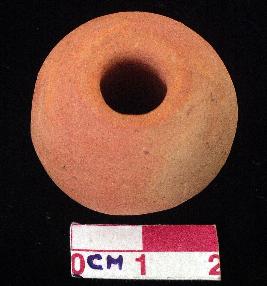 | Description / विवरण | Terracotta, red, domical spindle whorl with flat base. |