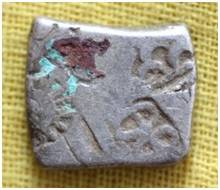 | Description / विवरण | The coin is irregular in shape. Obverse Sun, caduceus, three arched hill, vertical line. Reverse Blank. |