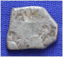 | Description / विवरण | The coin is irregular in shape. Obverse Three arrows and three taurines around a circle, Sun, wheel, three arched hill with a crescent. Reverse Four taurines around a dot. |