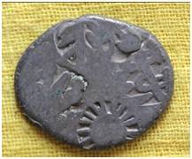 | Description / विवरण | The coin is an imperial type of Punch- marked coin. It is oval in shape. Obverse Sun, Six armed wheel, tree, a vertical lines flanked by two taurines and other symbols are not clear. Reverse The symbols are not clear. |