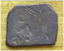 | Description / विवरण | The coin is an imperial type of Punch- marked coin. It is irregular in shape. Obverse Sun, three arrows and three taurines around a circle with a conspicuous dot, animal, and other symbols are not clear. Reverse Symbols are not clear. |