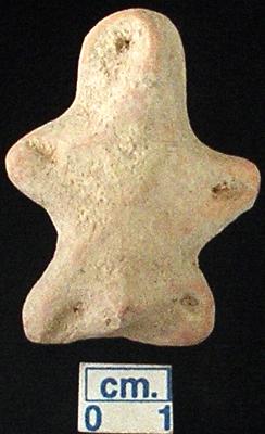 | Description / विवरण | An archaic terracotta human figurine with round head, red, pinched nose, pin hole eyes, slit mouth, short out stretched arms with one incised line in each, shrot wide bridged stumpy legs with one incised line in each, treated with red wash, handmade. |
