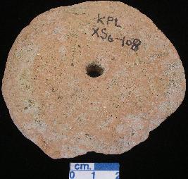 | Description / विवरण | A terracotta spindle whorl , dull red in colour, circular in shape, medium fabric, mid perforation. |
