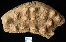 | Description / विवरण | Fragment of a terracotta skin rubber, red in colour and treated with red slip all over which is being pealed off, multiple denticulation marks on parellel rows. |