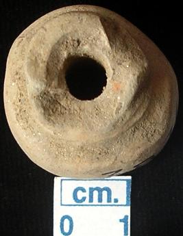 | Description / विवरण | A terracotta Spildle Whorl, Grey in colour, flate round base, btton nobed top, partly damaged, a perforation in centre, handmade. |