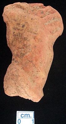 | Description / विवरण | Fragment of an unidentified terracotta object, red in colour, pinched ear shape design with four deep incised lines made on one side, another side has an applique round bangle shape decoration seen, handmade. |