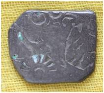 | Description / विवरण | The coin is an imperial type of Punch- marked coin. It is rectangular in shape. Obverse Sun, three arrows and three taurines with in ovals around a circle with a conspicious dot, four taurines around a male figure and other symbols are not clear. Reverse Tree and other symbols are not clear. |