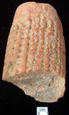 | Description / विवरण | Fragment of a terracotta skin rubber, red in colour, multiple denticulation marks on all over the cylindrical body, circular one end partly damaged. |