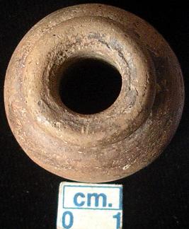 | Description / विवरण | A terracotta ghat shaped bead, dull red, a ring base top like rim of a ghat, flat base due to sharp cut, treated with black slip all over which is being pealed off, a broad vertical hole across. |