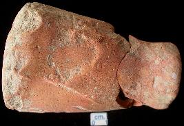 | Description / विवरण | A terracotta Dabber, red in colour, treated with red slip, toppering sides, flate top and bottom, two holes seen in the bottom, one side and upper part with top broken. |