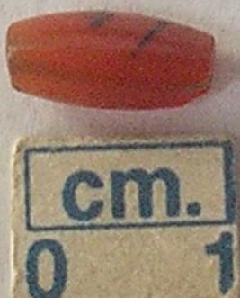 | Description / विवरण | A stone bead, red in colour, cylindrical shape, trangular profile, a horizental perforation, across.. |