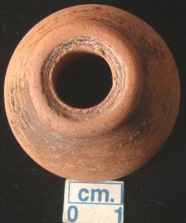 | Description / विवरण | A terracotta ghat shaped bead, red in colour, ring shape top,tappering sides, flat base, a vertical perforation across. |